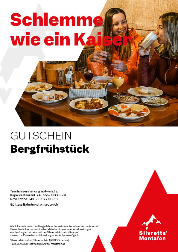 Buchung am Vortag bis 16.00 Uhr im Kapellrestaurant: +43 5557 6300-561 und in der Nova Stoba: +43 5557 6300 bzw. service@silvretta-montafon.at Das Bergfrühstück findet nur im Rahmen der Sonnenaufgangsfahrten Hochjoch Totale und Nova Exklusiv statt. Gekaufte Gutschein werden per E-Mail verschickt, wir versenden keine Gutscheine per Post. Am Ende des Bestellvorgangs kannst du den Gutschein zusätzlich herunterladen, ausdrucken oder direkt an den Beschenkten weiter leiten.